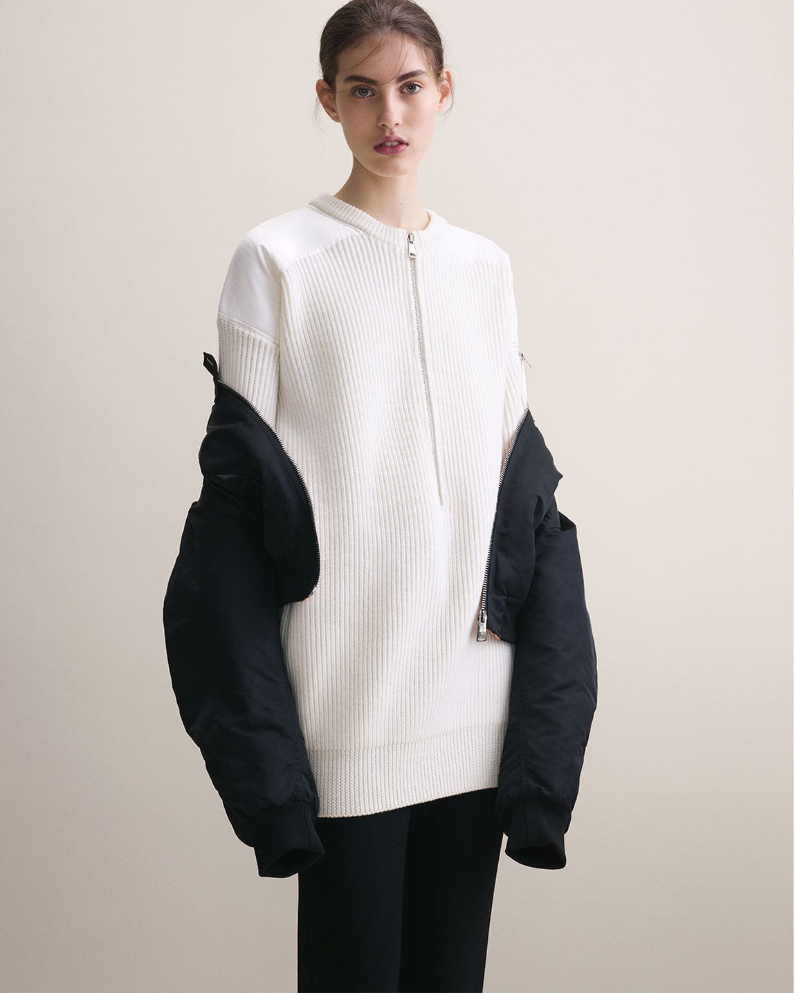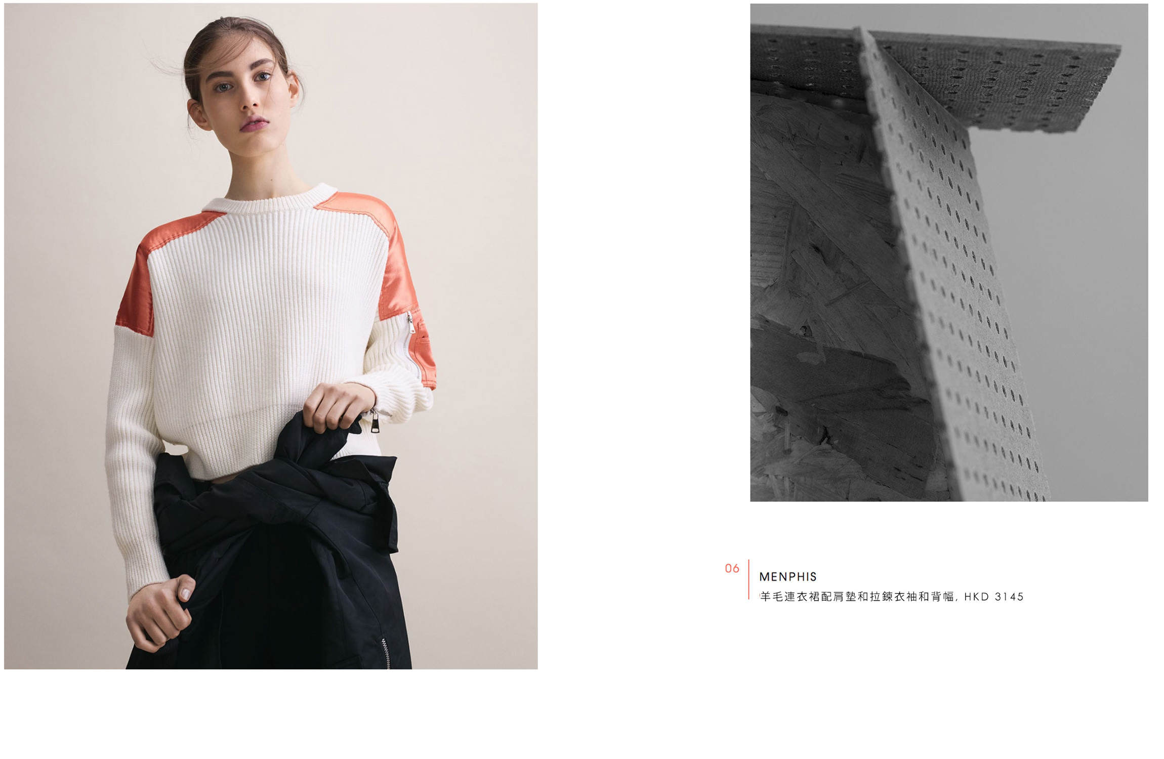 又或配以橙色緞料肩墊的中性毛衣,展現酷氣時尚。