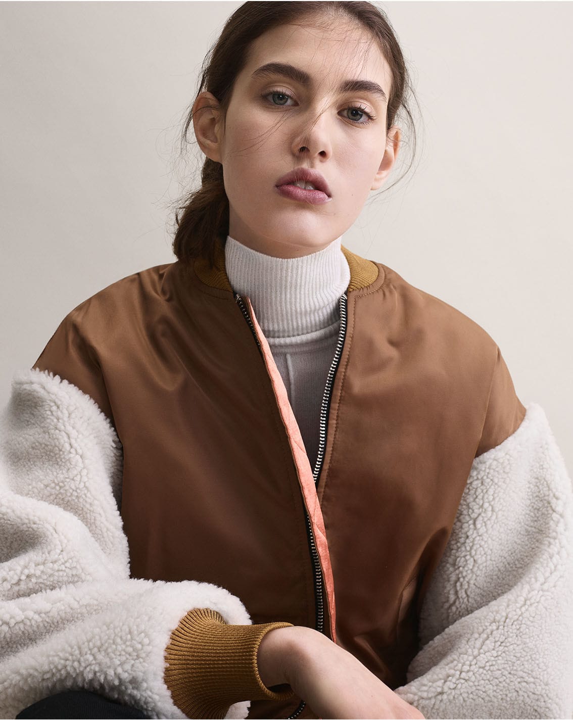 焦糖色棒球夾克以復古物料製造,配以柔軟羊毛衣袖,